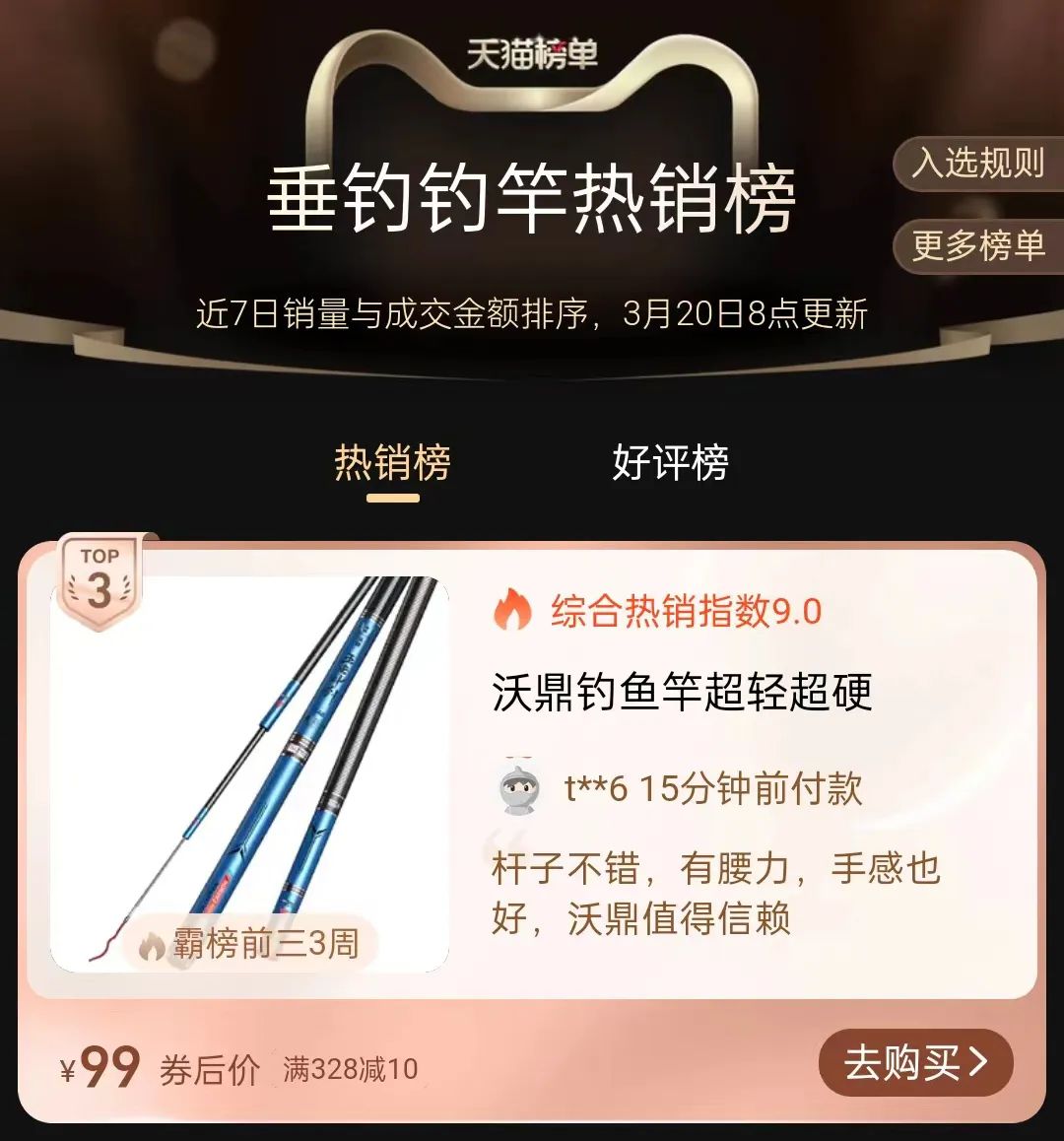 王者神剑上市首发期间一直领跑于“天猫碳素钓竿热销榜”榜单产品热度持续飙升,好评如潮