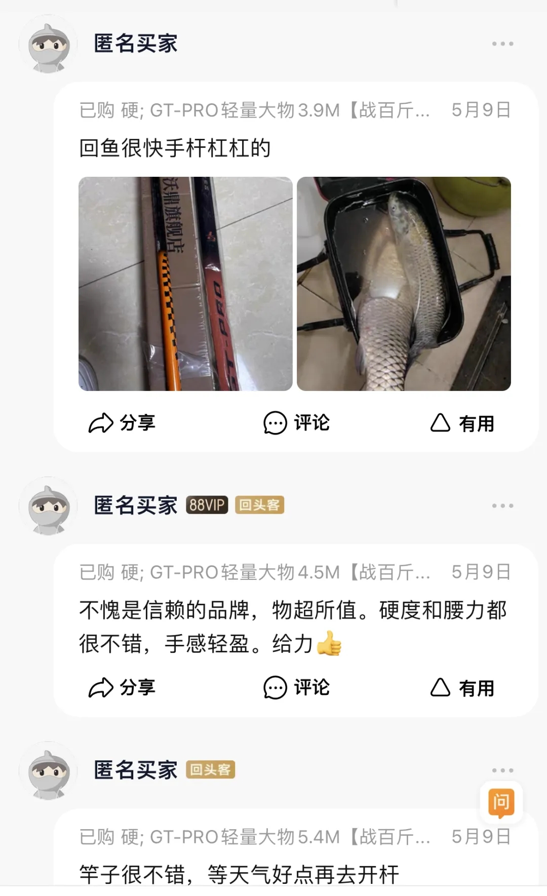 沃鼎新品 「GT超跑系列大物竿」 首发初露锋芒便圈粉无数 GT PRO轻量版 个别米段库存更是一度告急 实力出众 好评如潮 钓友真实反馈 近一周 已经有很多钓友陆续收到了这款竿子 并进行下水开光实钓 钓友们普遍反馈这款竿子 手感好、颜值高、腰力强悍不重头 性能优越、售后贴心 下面就让我们正式开启渔获秀 一起见证GT PRO轻量版的高光时刻吧~ GT PRO轻量版大物竿 竿身轻量硬挺手感一绝 控鱼有力、回鱼迅速 老麻雀钓场里的大物能轻松拿捏 休闲野钓也完全不在话下! 不仅性能数一数二 价格也是“真”香 秒杀价159起 有需要的钓友们千万不要错过~