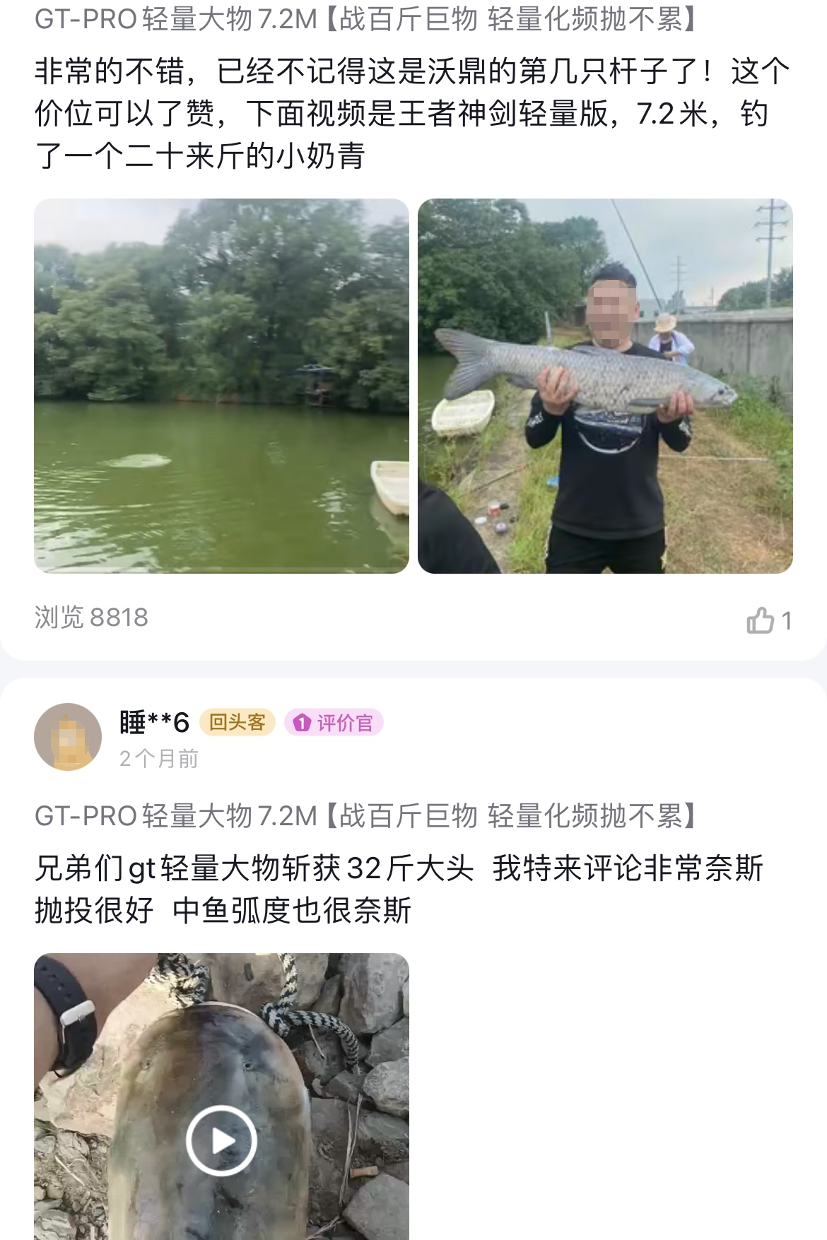 「GT超跑系列大物竿」 面市两个多月以来 一路圈粉无数 GT PRO轻量版 全渠道销量领先 实力硬核 好评如潮 面市以后 一直活跃于各大平台榜单 面市两个多月 也依旧占据平台榜单 荣登 “ 天猫•碳素钓竿热销榜 ” “ 抖音•钓竿好价金榜 ” 钓友真实反馈 竿子好不好 收到货的钓友们才有发言权 各大平台评论区的钓友们 都在购入后进行了下水实钓 并一致认为这款竿子 持感舒适 颜值抗打 腰力强悍不重头 性能够优越 售后有保障 下面就来看看大家的真实评价吧~ 众多好评中 不乏很多一直支持沃鼎的回头客 足见沃鼎的产品可谓是有口皆碑 「GT超跑系列大物竿」 竿身硬挺 手感轻盈 频抛不累 挑战50斤的大物不在话下 不仅性能数一数二 价格也是“真”香 【售价139起】 这款能狂搏大物的高颜值利器 你一定不能错过!