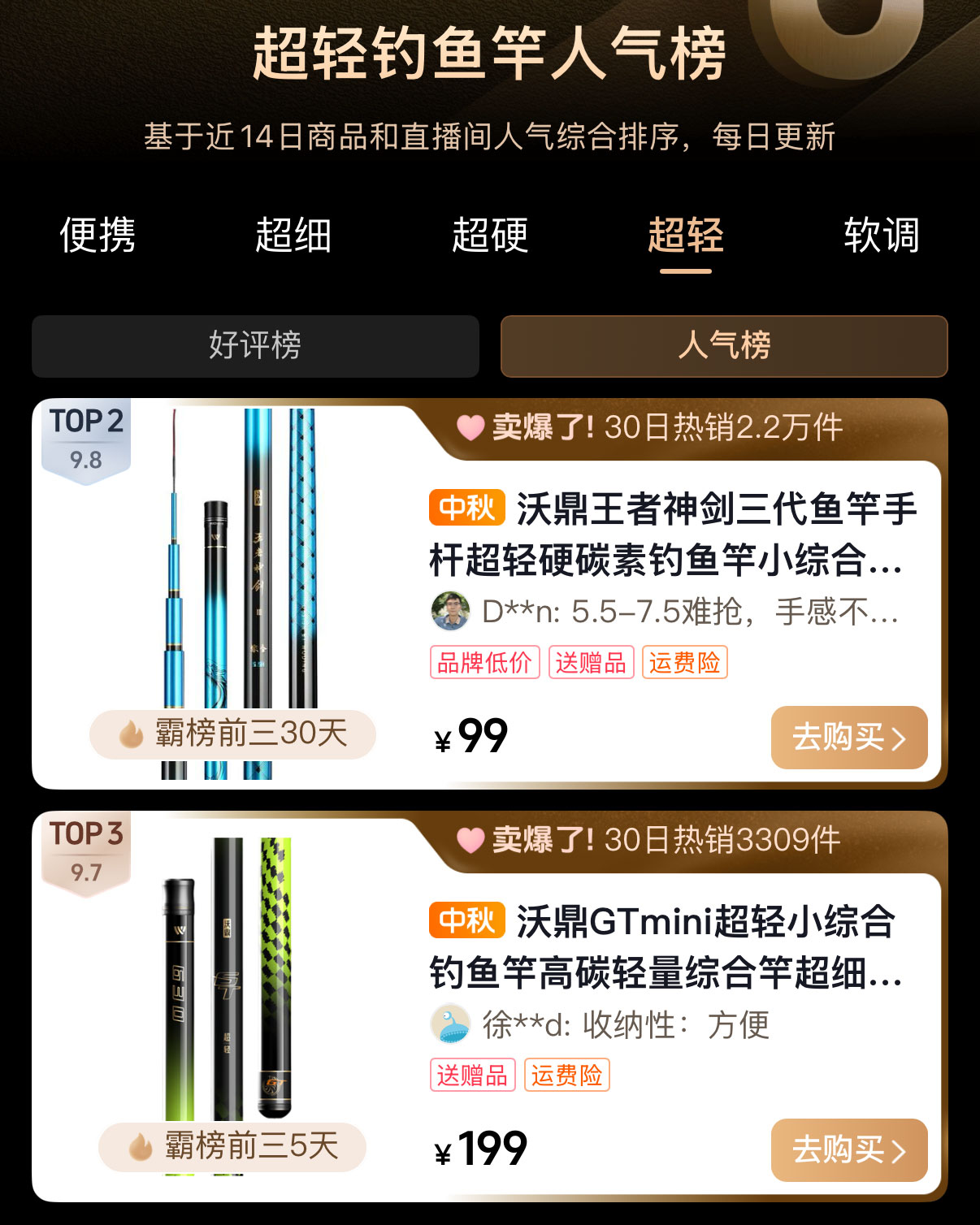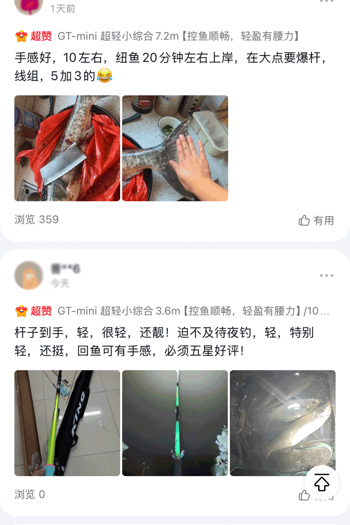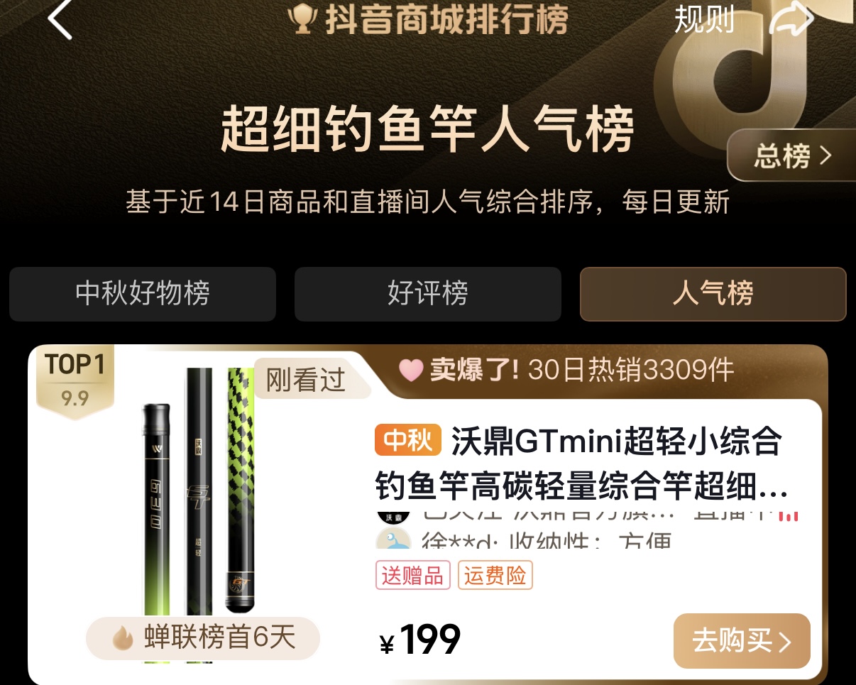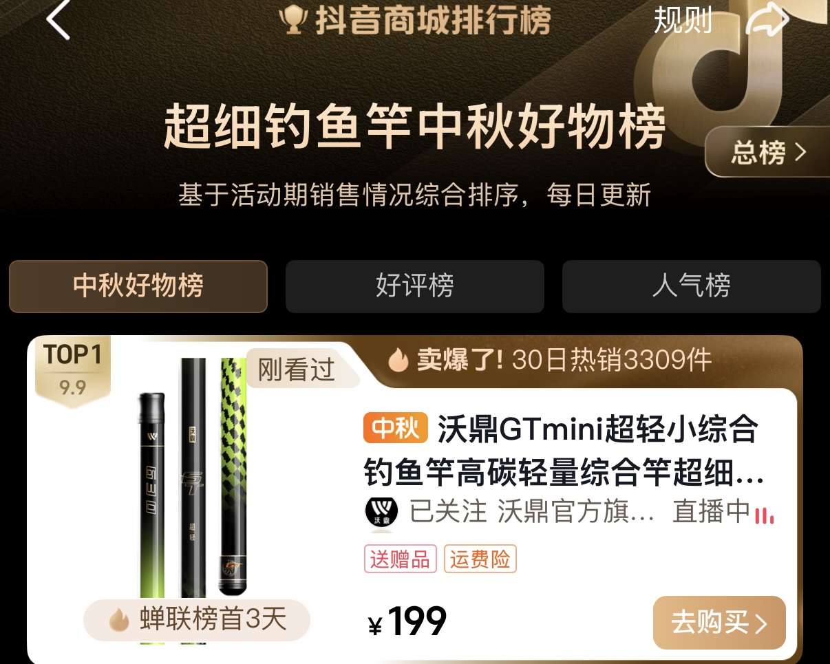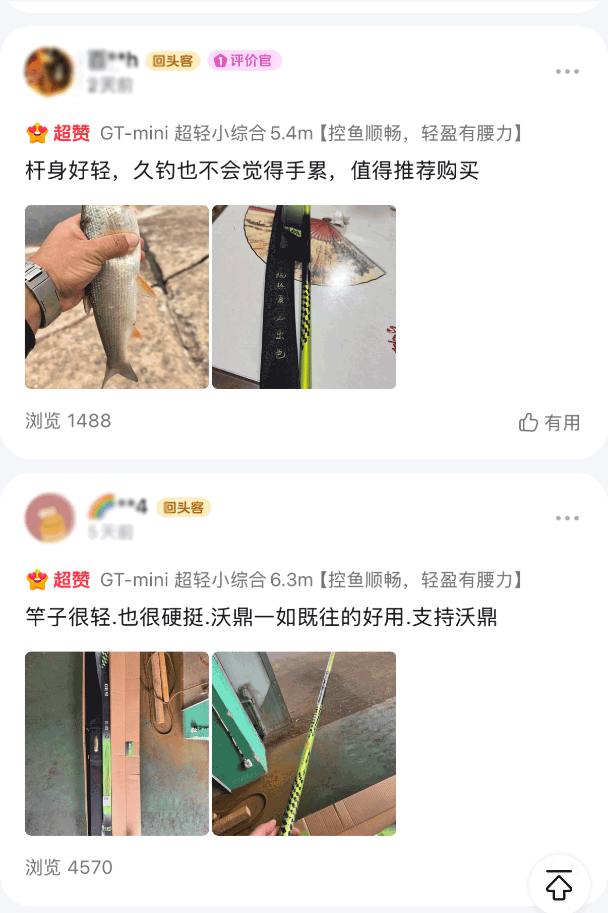 hello钓友们 得益于大家对沃鼎产品的信任与支持 GT Mini超轻小综合竿 自9月21日20:00首发以来 便开启了销量狂飙模式 3.9m规格上架即空 直接卖到断货 其他米段也只能开启预售模式 工厂生产线已经全力运转 却还是供不应求 足见这款竿子的爆款属性! 除此之外 GT Mini超轻小综合竿 首发后还一路领跑 抖音商城钓竿品类几大榜单 荣获 更加值得一提的是 这款竿子不光在9月21日的 很多收到了竿子的钓友 也都在官方评论区不吝夸赞 纷纷秀起了新品下水作钓的照片和鱼获 以及使用感受 钓友们普遍评价这款竿子 自重轻、颜值高、手感好 性能与数据都非常抗打~ 不愧是超轻小综合! 怎么样钓友们 销量、口碑、数据都这么能打的竿子 你是不是也心动了呢~ 这款堪称手感天花板的超轻小综合竿 现火爆热售中 秋冬野钓 想跟评论区的钓友们一样 “轻”装上阵 体验连竿飞鱼的乐趣 选GT Mini超轻小综合就对啦!!!第一届沃鼎粉丝“华山论剑”垂钓大赛中表现亮眼