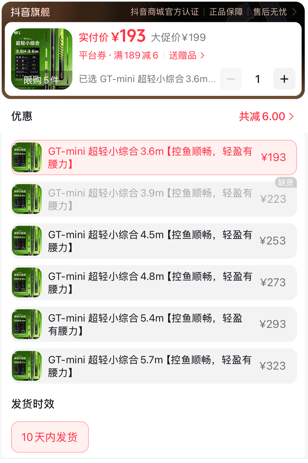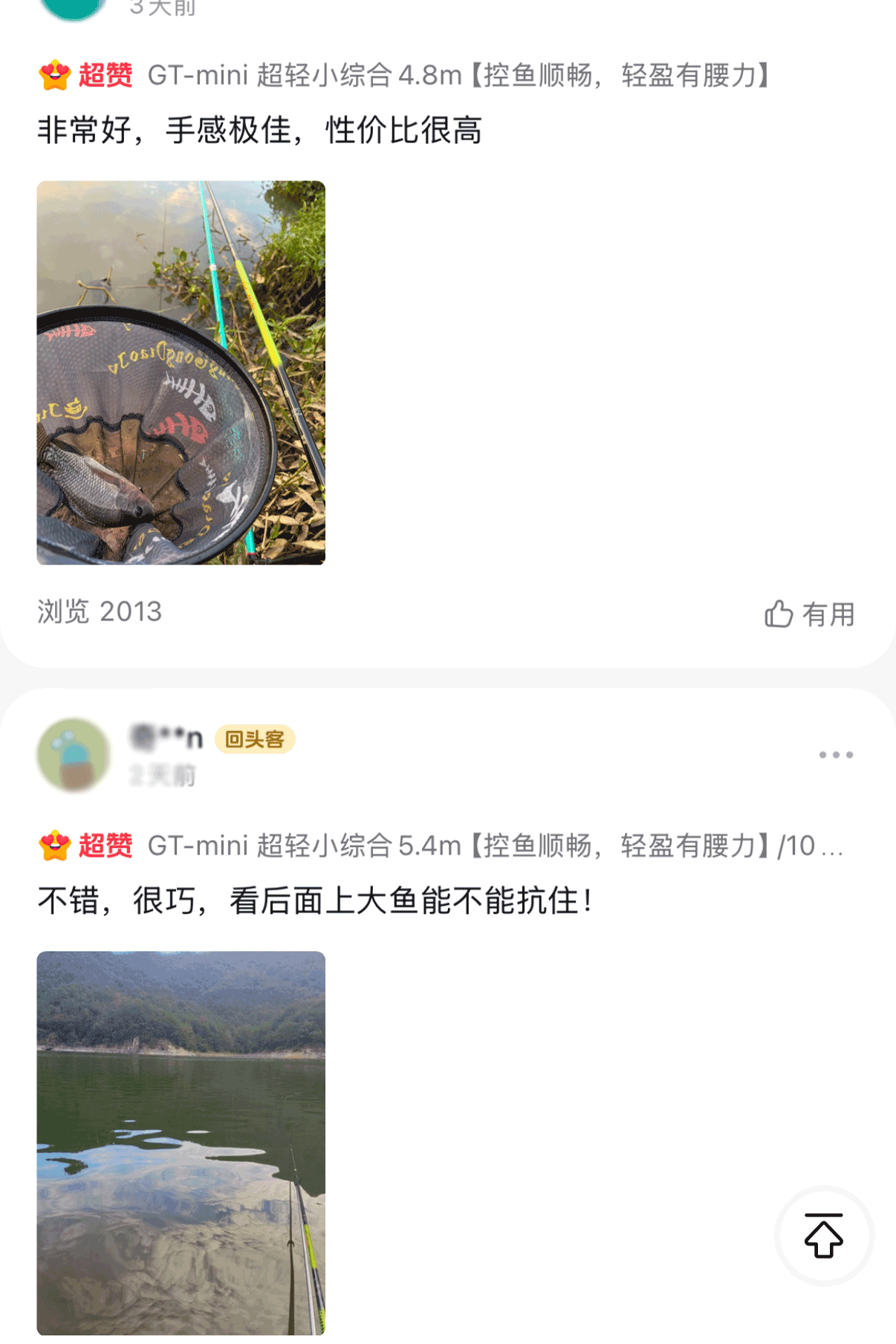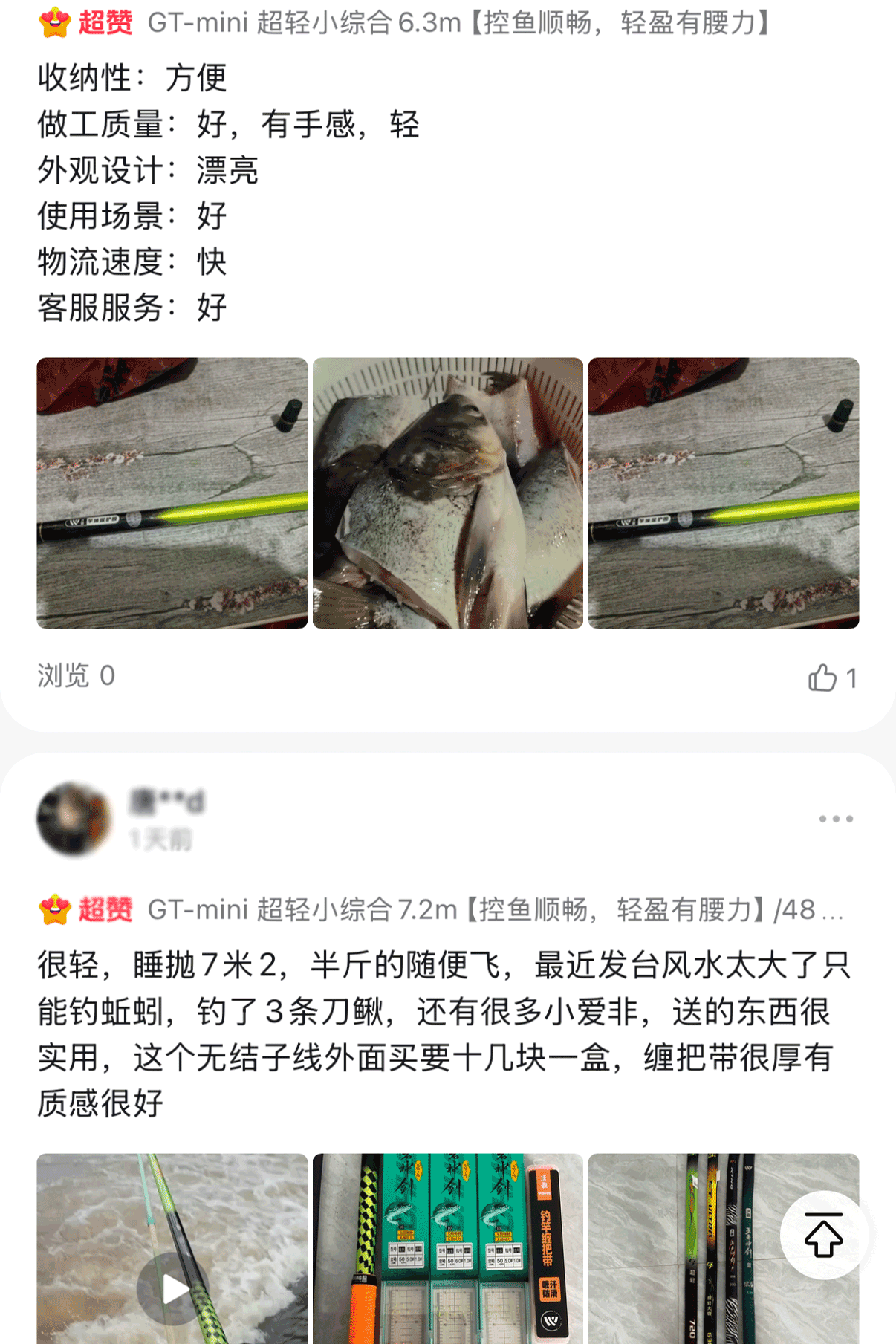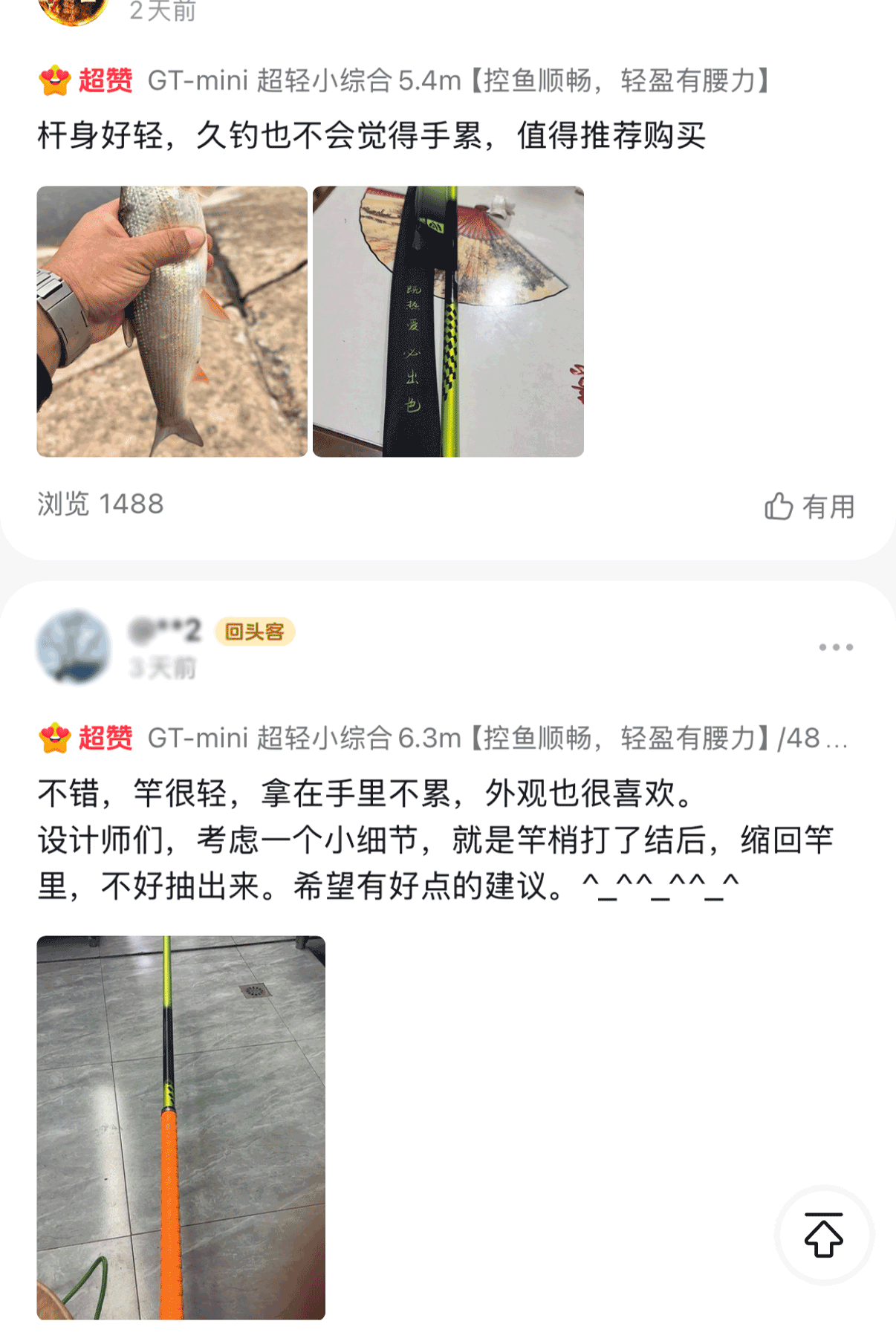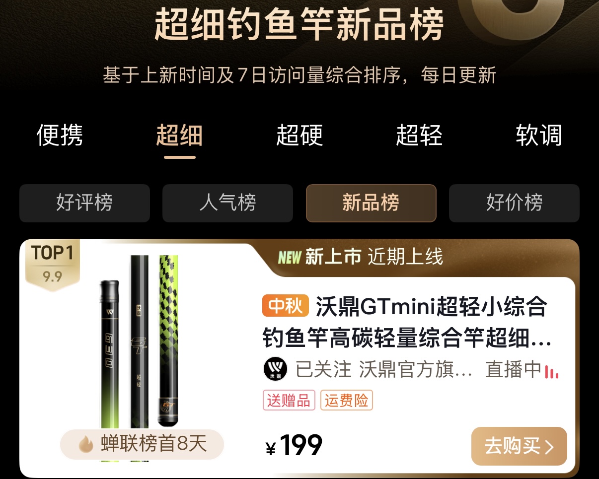 hello钓友们 得益于大家对沃鼎产品的信任与支持 GT Mini超轻小综合竿 自9月21日20:00首发以来 便开启了销量狂飙模式 3.9m规格上架即空 直接卖到断货 其他米段也只能开启预售模式 工厂生产线已经全力运转 却还是供不应求 足见这款竿子的爆款属性! 除此之外 GT Mini超轻小综合竿 首发后还一路领跑 抖音商城钓竿品类几大榜单 荣获 更加值得一提的是 这款竿子不光在9月21日的 很多收到了竿子的钓友 也都在官方评论区不吝夸赞 纷纷秀起了新品下水作钓的照片和鱼获 以及使用感受 钓友们普遍评价这款竿子 自重轻、颜值高、手感好 性能与数据都非常抗打~ 不愧是超轻小综合! 怎么样钓友们 销量、口碑、数据都这么能打的竿子 你是不是也心动了呢~ 这款堪称手感天花板的超轻小综合竿 现火爆热售中 秋冬野钓 想跟评论区的钓友们一样 “轻”装上阵 体验连竿飞鱼的乐趣 选GT Mini超轻小综合就对啦!!!第一届沃鼎粉丝“华山论剑”垂钓大赛中表现亮眼